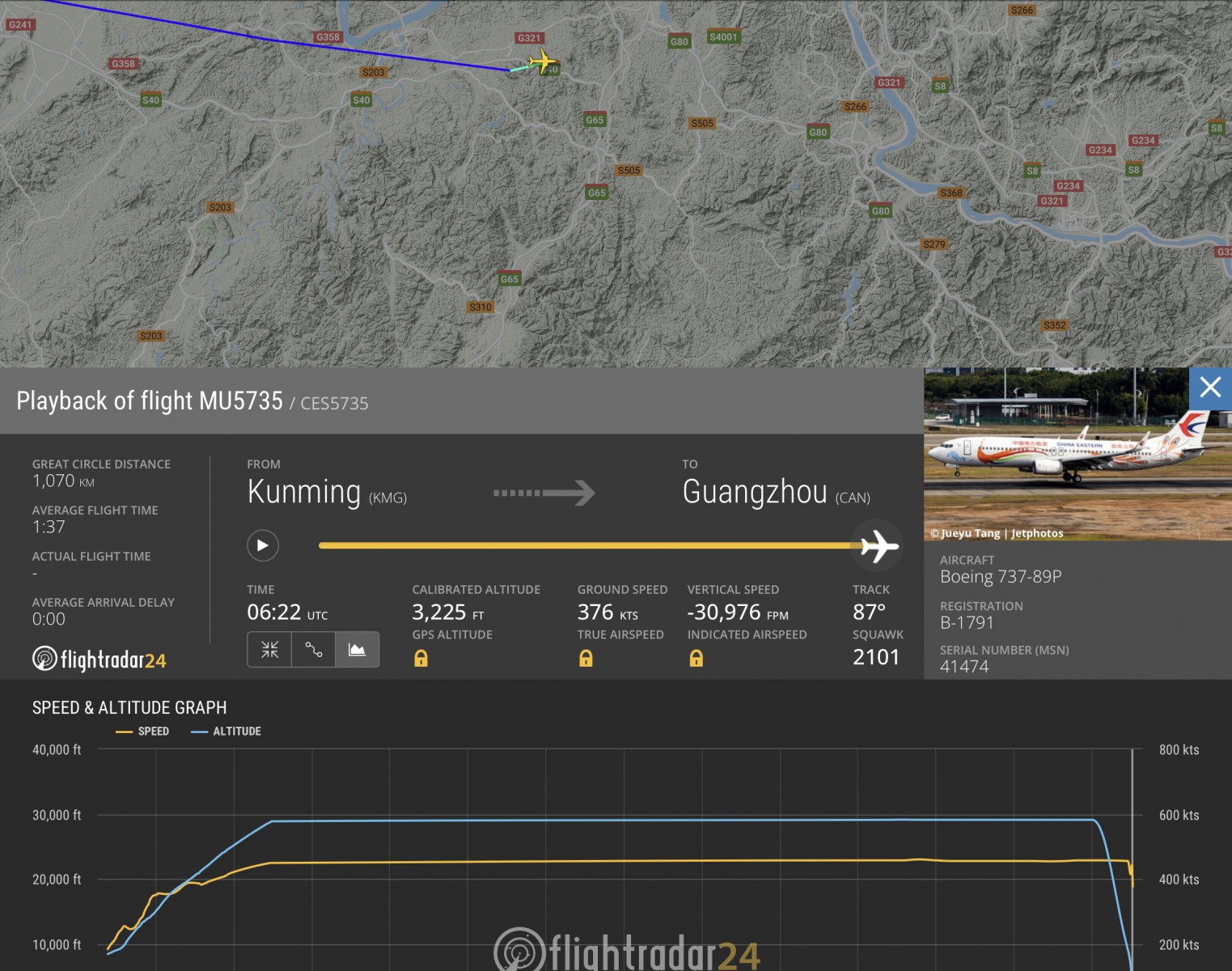 China Eastern Airlines flight MU5735 has crashed en route from Kunming to Guangzhou China with a reported 132 aboard.