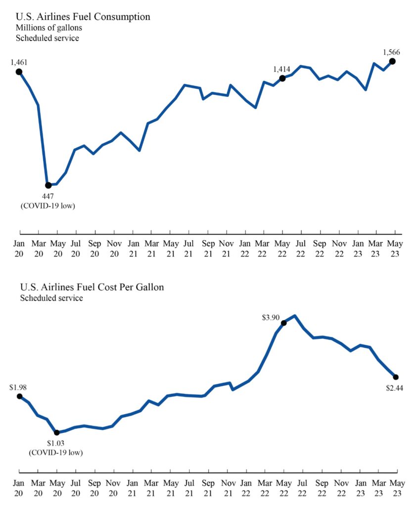The Department of Transportation’s Bureau of Transportation Statistics (BTS) today released U.S. airlines’ May 2023 fuel cost and consumption numbers indicating U.S. scheduled service airlines used 1.566 billion gallons of fuel, 5.5% more fuel than in April 2023 (1.484 billion gallons) and 1.1% less than in pre-pandemic May 2019. The cost per gallon of fuel in May 2023 ($2.44) was down 22 cents (8.1%) from April 2023 ($2.66) and up $0.33 (15.6%) from May 2019. Total May 2023 fuel expenditure ($3.82B) was down 3.1% from April 2023 ($3.94B) and up 14.3% from pre-pandemic May 2019.