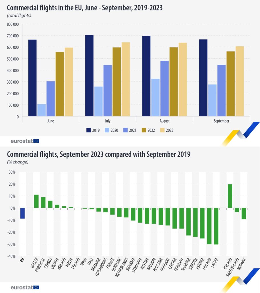 In September 2023, there were 605 806 commercial flights in the EU. This marked a 7.9% increase when compared with the flight count in September 2022. However, the figure remained 8.9% lower than the flight count for the same month in 2019.